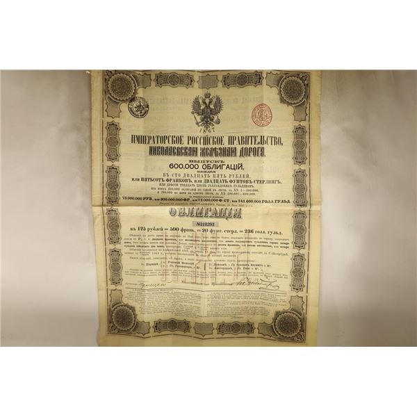 1867 NICOLAS RAILROAD RUSSIAN BOND SHARE CERT295 - 1867 NICOLAS RAILROAD RUSSIAN BOND SHARE CERT