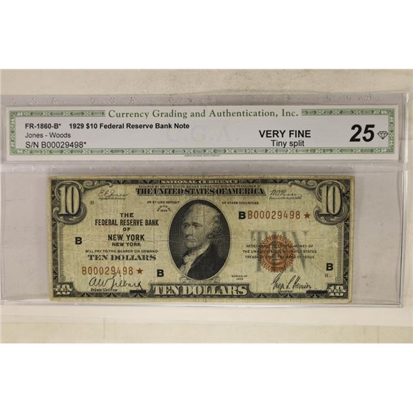 1929 US $10 FRN STAR NOTE CGA VERY FINE 25 TINY296 - 1929 US $10 FRN STAR NOTE CGA VERY FINE 25 TINY