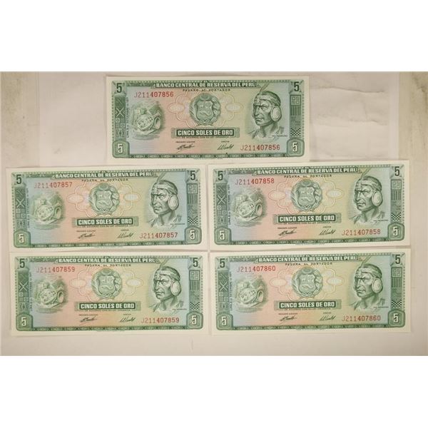1971 CENTRAL BANK OF PERU 5 SOLES CRISP UNC BILLS