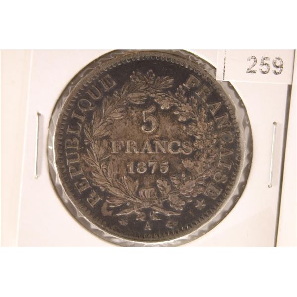 1875-A FRANCE SILVER 5 FRANC COIN. .7234 OZ. ASW