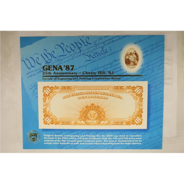 SOUVENIR CARD WITH THE REVERSE OF A 1907 $10 GOLD CERTIFICATE, PRINTED BY THE BUREAU OF ENGRAVING AND PRINTING