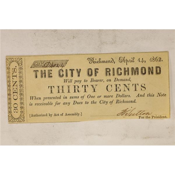 1862 THE CITY OF RICHMOND 30 CENT OBSOLETE BANK