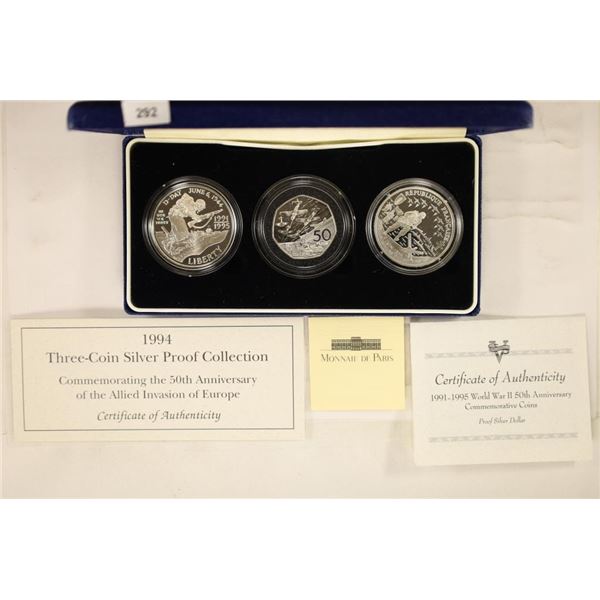 THE 50TH ANNIVERSARY OF THE ALLIED INVASION OF EUROPE. CONTAINS: 1991-W PROOF SILVER DOLLAR, 1993 FRANCE ONE FRANC PROOF COIN AND 1994 UNITED KINGD