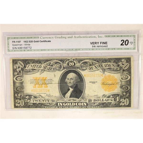 1922 US $20 GOLD CERTIFICATE CGA VERY FINE 20 INK