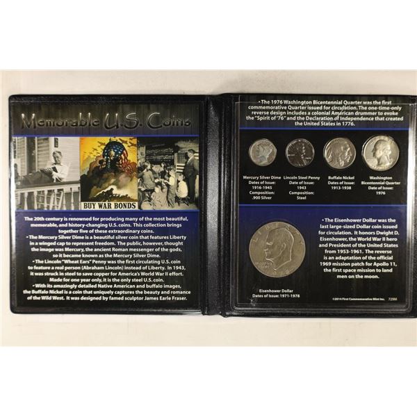 1978 IKE DOLLAR, 1976 WASHINGTON QUARTER, 1937 BUFFALO NICKEL, 1943 STEEL LINCOLN CENT AND 1944 SILVER MERCURY DIME. IN NICE BLACK FOLIO