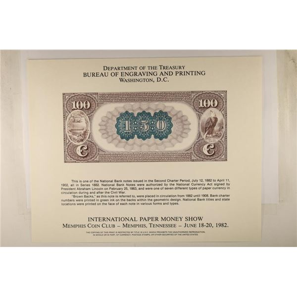 1982 FEATURING A SOUVENIR CARD OF THE REVERSE OF AN 1882 $100 US BANK NOTE
