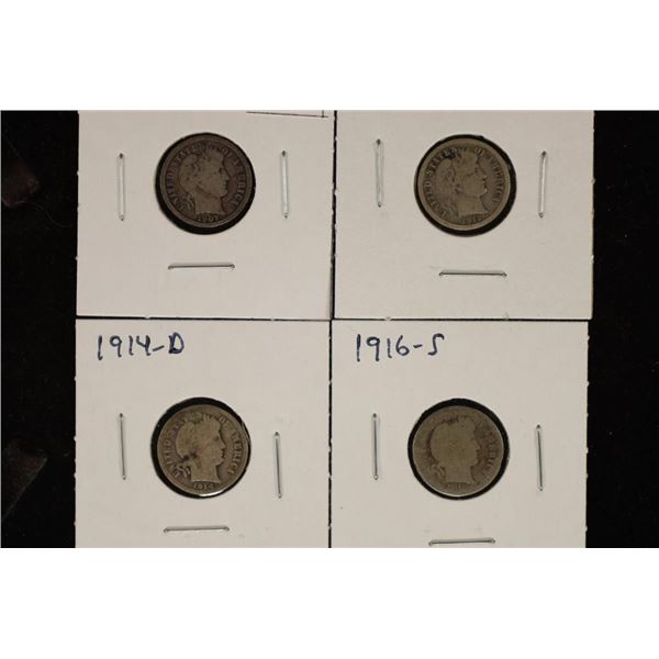4 ASSORTED SILVER BARBER DIMES: 1907-S, 1912-D,136 - 4 ASSORTED SILVER BARBER DIMES: 1907-S, 1912-D,