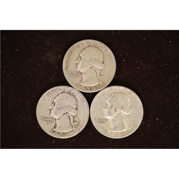 3-WASHINGTON SILVER QUARTERS: 1950, 1951-D & 1959