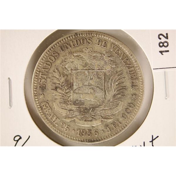 1936 VENEZUELA SILVER 2 BOLIVARS .7234 OZ. ASW