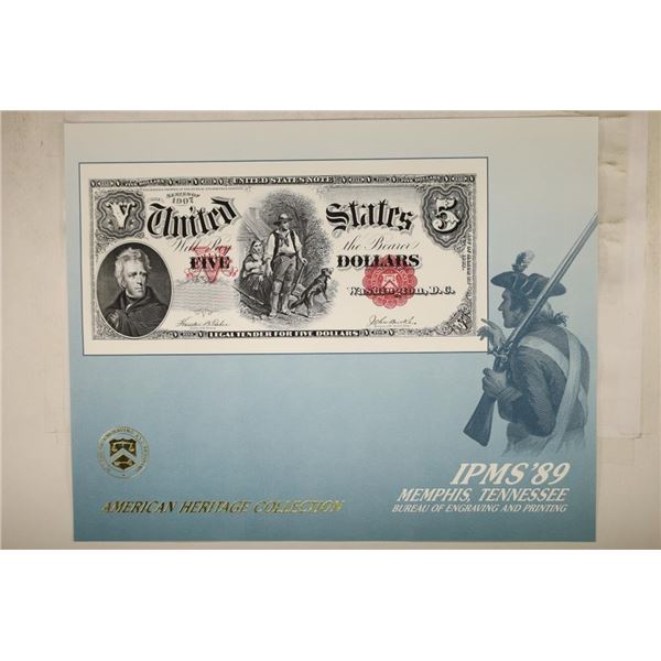 COLLECTION SOUVENIR CARD FEATURING AN ENGRAVING OF THE OBVERSE OF A 1907 SERIES $5 US NOTE, PRINTED BY THE BUREAU OF ENGRAVING AND PRINTING