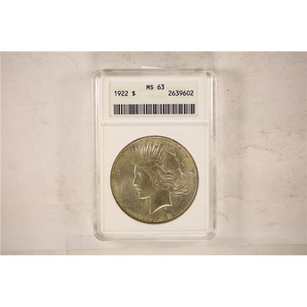 1922 PEACE SILVER DOLLAR ANACS MS63