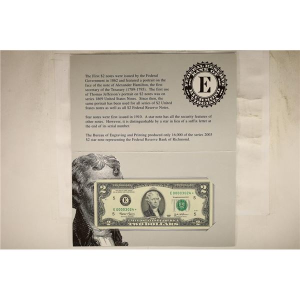 2003 $2 FRN STAR NOTE LOW SERIAL NUMBER E00003024