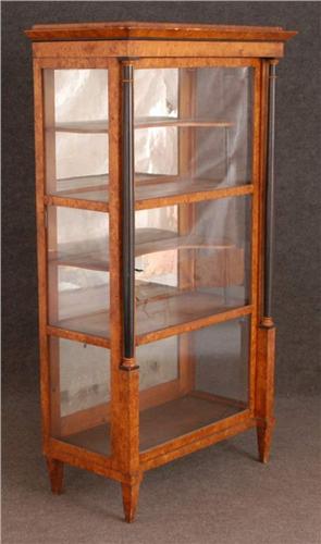 BIEDERMEIER BURLED ELM VITRINE with ebonised columns and mirrored back, 63"x31"x16" 19th century <BR>condition: veneer splits, chipping and buckling at spots, mirrored back with a break