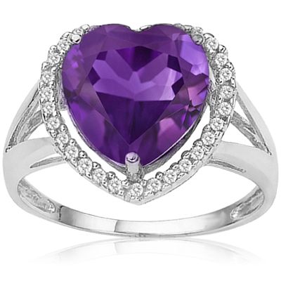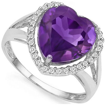 BIG 10MM HEART AMETHYST, DIAMOND ACCENT SILVER RING