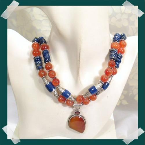 Vera has chosen a carnelian silver pendant for the center which has a total drop of 60mm. (25mm=1") Our lapis silver cap beads average 33mm in length with the carnelian having a diameter of 11mm. The double choker has a length of 19" sporting magnificent color suitable for any season.