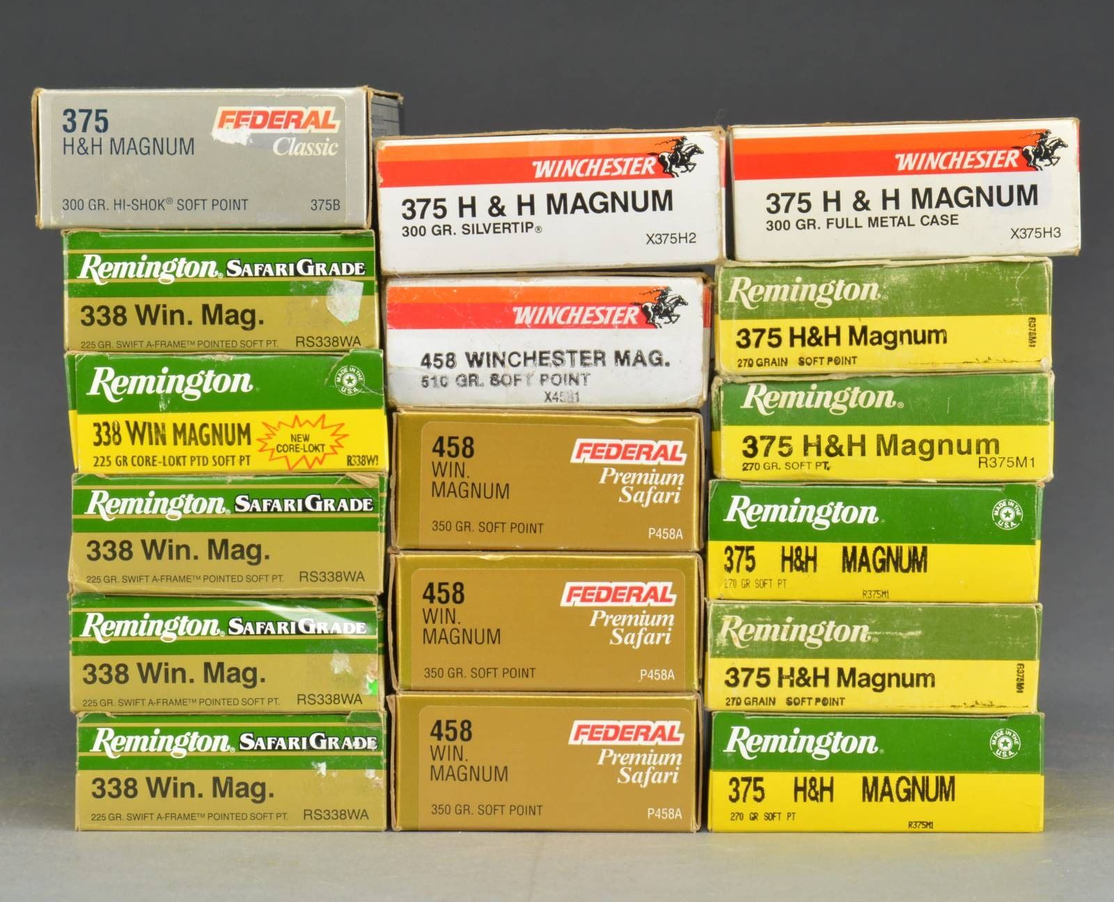 (occasional part box): 338 WIN. MAG.: Rem. 4-225 gr. Swift A-Frame PSP 225 gr. Core-Lokt PSP. 375 H&H MAG.: Federal Classic 300 gr. Hi-Shok SP / Win. 300gr. Silvertip / Win. 300 gr. FMC / 5 Rem. 270 gr. SP. 458 WIN. MAG.: 3 Federal Premium Safari 350 gr. SP / Win. 510 gr. SP. (02-14546-1/NW). $750-1,000.