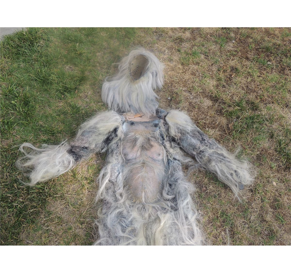 This is a very well made Abominable Snowman, yeti, Sasquach, or Big Foot costume. Includes the complete body suit, the matched pair of feet, which never come around, and the full head cowl. Missing the gloves, and facial appliance. All latex on a cloth body suit with real fur. This is by far the nicest Abominable Snowman, yeti, Sasquach, or Big Foot costume I have ever offered.