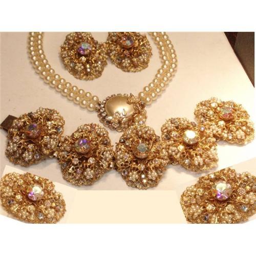 Lots of tiny wired on seed pearls decorate this huge layered gilt filigree bracelet, necklace and earrings. Talk about over the top GLAMOUR!!!! Runway style and lots of glitz really make this huge cluster set to FABULOUS! The necklace has a large pearl colored center with rhinestones all around it and tiny seed pearls. The bracelet is HUGE ( see photo next to a dime) and it has layers and layers of filigree and aurora borealis rhinestones. It measures 2" x 7 1/3" and is heavy and well made. The earrings are 2" and clip on ( see photos of the backs). The necklace measures 15" long. The set is in very good condition. A few of the tiny pearls are not as shiny as others. Unsigned.