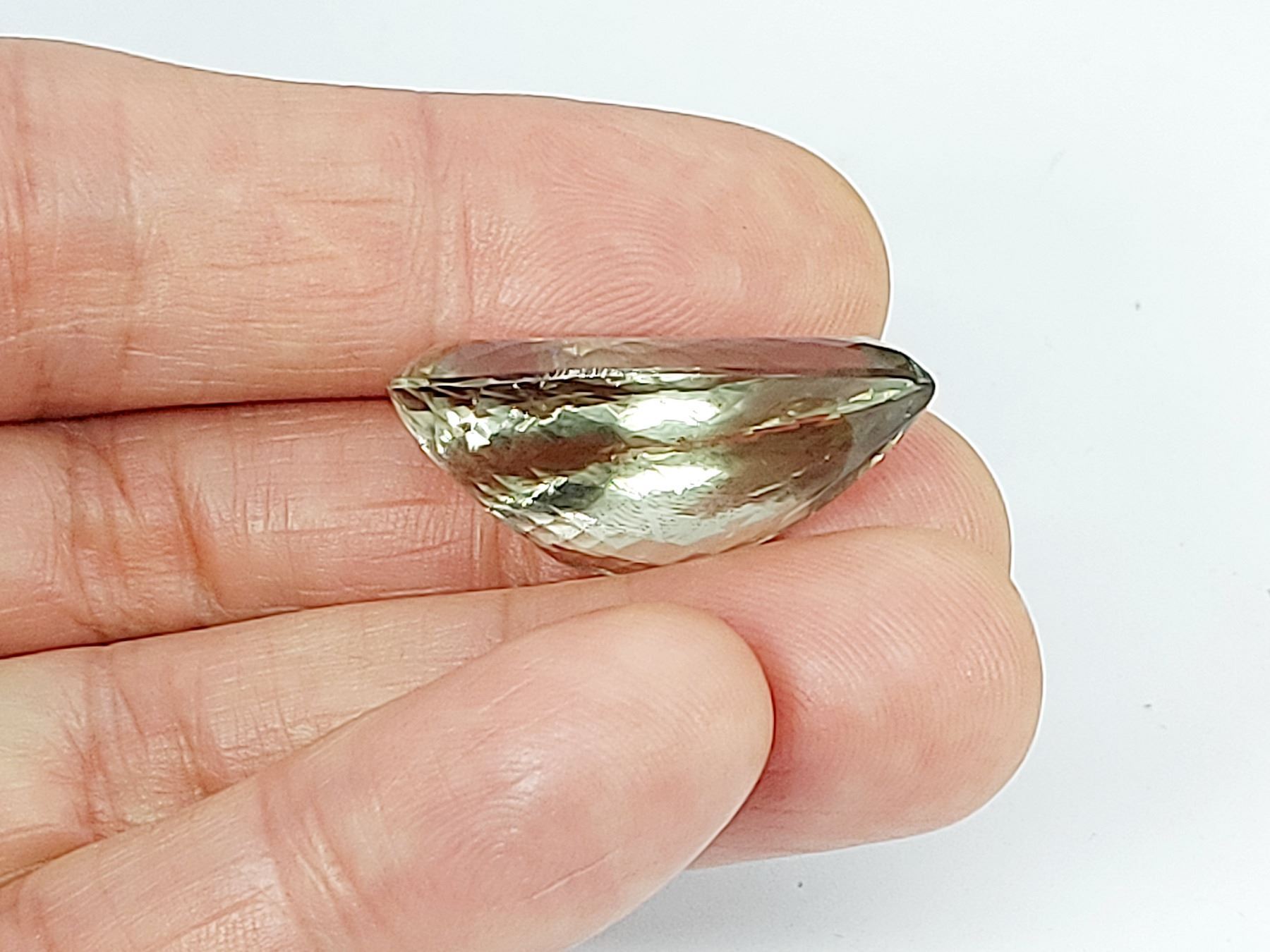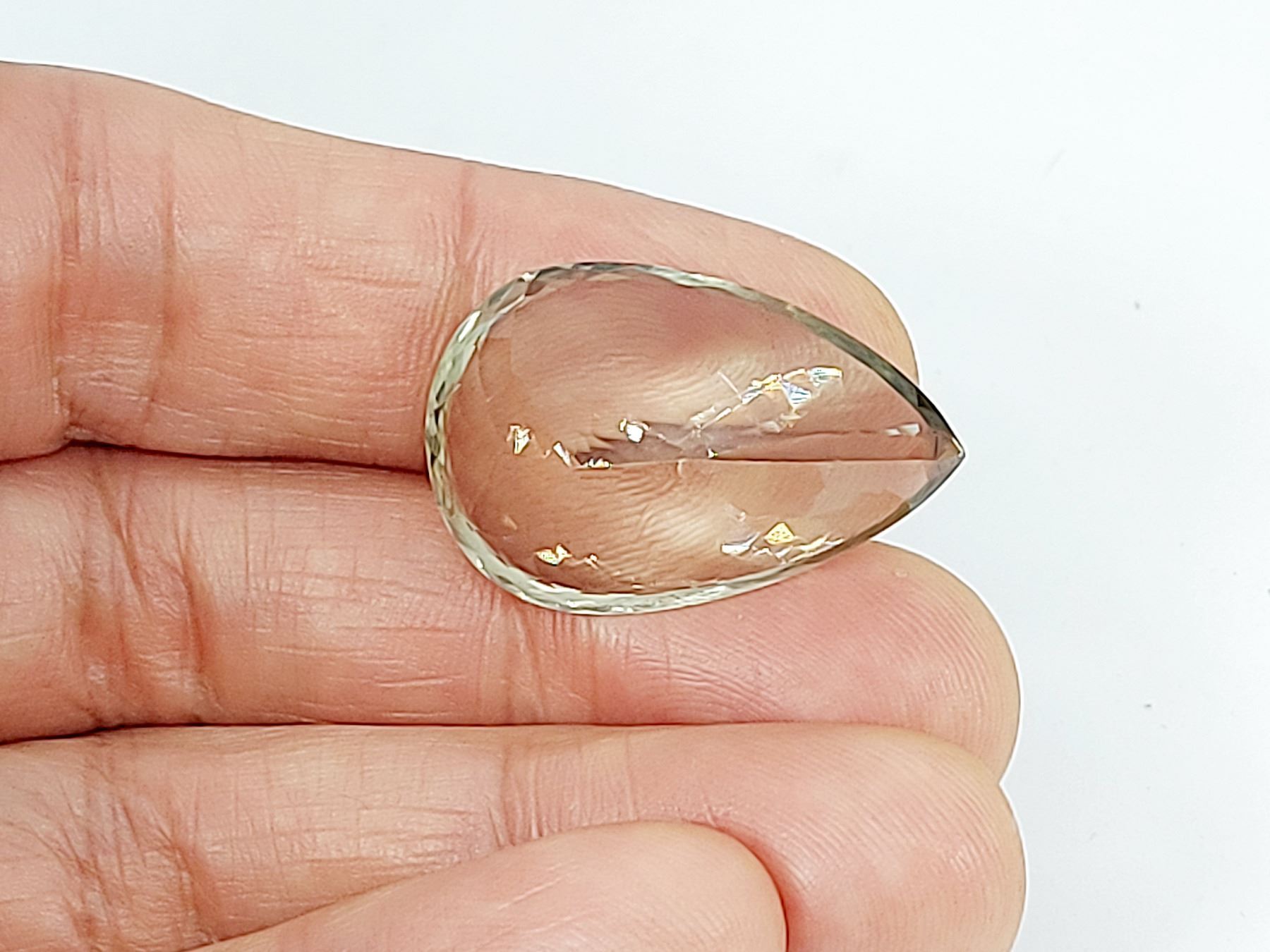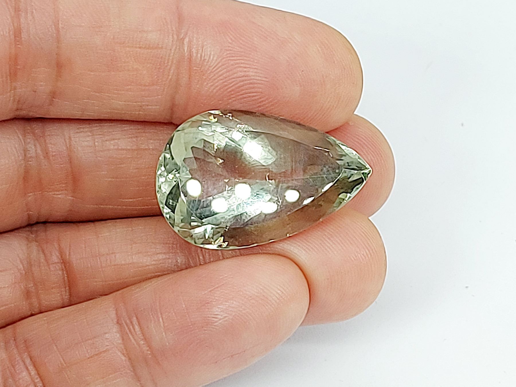 48.246 ct. 31.93 x 20.90 x 13.98 mm Colour: Light Green , Shape: Pear Cut , Clarity: Loupe Clean , Luster: Exceptional , Origin: Brazil Untreated Has small chip in front