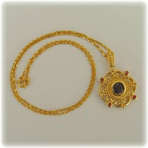 Solid 22 Karat Yellow Gold sets this truly exquisite and substantial Pendant Necklace. The center stone is either created or natural Tourmaline. We were unable to determine which. Whether it is created or natural, the stone is absolutely stunning, with deep Violet-Blue hues. A red stone (Ruby?) graces each of the four points of this eight pointed pendant. Filigree scrolls wind around the main stone to complement the scrolls framing the outside of the Pendant. <BR><BR>The Exotic Pendant is strung on a solid 22 Karat Yellow Gold Tiffany Chain of 18.5 Inches, which closes with a fancy Oriental Clasp. <BR><BR>