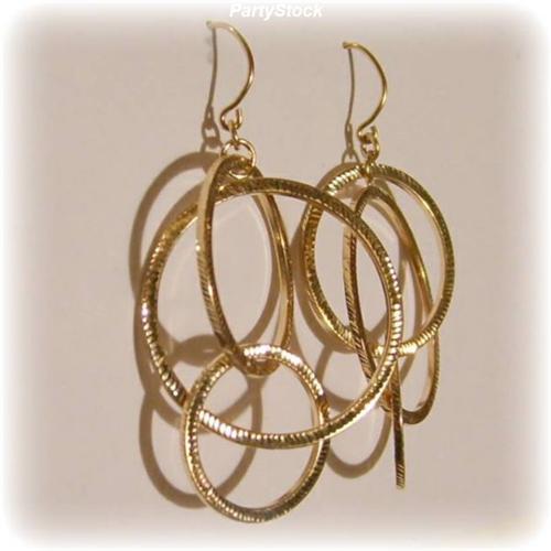 This is a pair of brilliant, multi-hoop Earrings. They have an etched finish which creates lots of shimmering light when worn. Three hoops cascade down from the Pierced Earring Wire for lots of movement. Large, yet lightweight for comfort due to their hollow centers. Perfectly designed! <BR> Detailed Specifications below. All items arrive in a velvet gift box with satin lining. See many other Hawaiian Gold Items in our store!