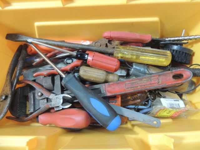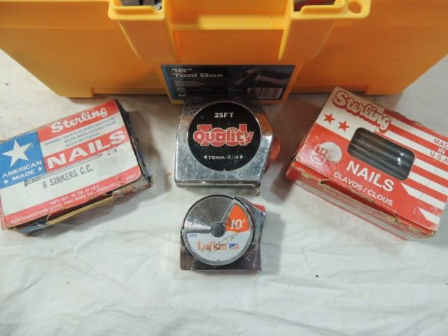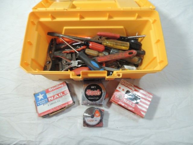 TAPE MEASURES, NAILS, SCREWS, FASTENERS, SCREWDRIVERS, PLIERS, WIRE STRIPPERS, NEEDLENOSE PLIERS, AND TONS MORE TOOLS IN THE BOX, AS SHOWN.
