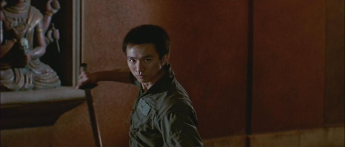 Screen used stunt jump suit worn by Dennis Dun as Wang Chi in BIG TROUBLE IN LITTLE CHINA.
