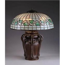 Lot 543 BIGELOW & KENNARD ACORN LAMP Wonderful Bigelow & Kennard lamp shade has nicely mottled clambroth background glass with subtle green acorns. Signed “Bigelow. Kennard & Co. Boston” and “Bigelow Studios”. The shade rests on a magnificent copper base that is reminiscent of a Grueby pottery design. The wonderful base is trimmed with silver and supports a three light cluster with acorn pulls. Marked on bottom “Copper & Silver”. SIZE: Shade is 18” dia. Overall height is 21-1/2”. CONDITION: Shade has several cracked border panels, but all are tight and intact. The base is very good to excellent. 5-70840
