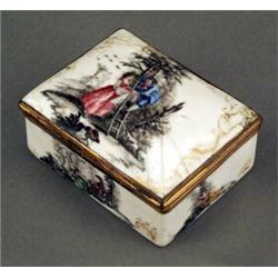 BIJOUTERIE - A French porcelain rectangular snuff box, the cover painted with fruit pickers, the...