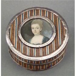 A French tortoiseshell circular box and cover, the exterior striped in gold, white and blue, the cover set with a miniature portrait of a lady and with engraved silver mounts, 3in diam, late 18th century (minor damage)