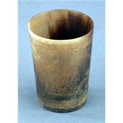 A George III horn commemorative beaker, engraved with portrait of Princess Charlotte, an urn inscribed with the date of her death '6th November 1817' and with ship, 3in high