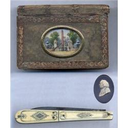 A penknife, the ivory handle incised with lozenges and gold pique; a card box in the form of a book inset with panel painted with view of the Tuileries Gardens; a small cameo (3)