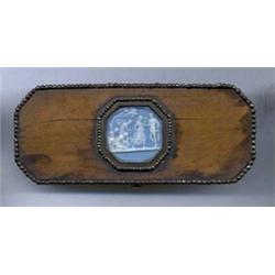 An English wooden toothpick case, with canted corners, the top inset with blue and white jasper cameo of classical figures within a cut steel frame and cut steel border, 3.25in wide, probably Matthew Boulton