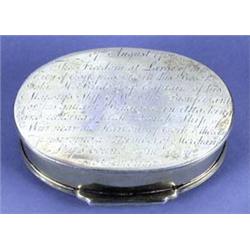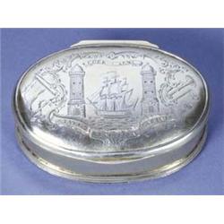 BIJOUTERIE - A George III Irish silver-gilt City of Cork Freedom box, oval, with moulded borders and plain thumbpiece, the hinged cover engraved with the arms of Cork within decorative foliate scroll mantling, flag and anchor, engraved inscription to the underside, '17th August 1780 The Freedom at Large of the City of Cork presented in this Box to John McBride Esq. Captain of his Majesty's Ship of War the Bienfeisant for his gallant Behaviour in Attacking and takeing [sic] a large French Ship of War near the Harbour of Cork and thereby preserving a number of Merchant Ships bound from Cork to America', 3.5in wide, 1.25in high, sponsor's mark only, rubbed but probably William Reynolds of Cork, 1780, 4.5oz (see illustration) John McBride (d.1800) was appointed commander of the Beinfeisant, a ship of some 64 guns, on 6 November 1776. The 'Attacking and takeing' of the Comte d'Artois for which he was awarded the honour of the Freedom of the City of Cork took place on the 13th August, 1780. The Bienfaisant was instructed to find a large French privateer that was blocking the fairway on the south coast of Ireland. The ship, the Comte d'Artois had 60 guns and carried over six hundred men. Although superior in number of men, the French attempt to grapple and board the Beinfeisant was unsuccessful due to Mcbride's sustained fire. After a sharp action of a little over an hour and with the threat of fresh attack from another ship, the Charon, the Comte d'Artois surrendered. Exhibited by Lord Scarsdale at the Fine Art Exhibition, Derby, 1877, no.28
