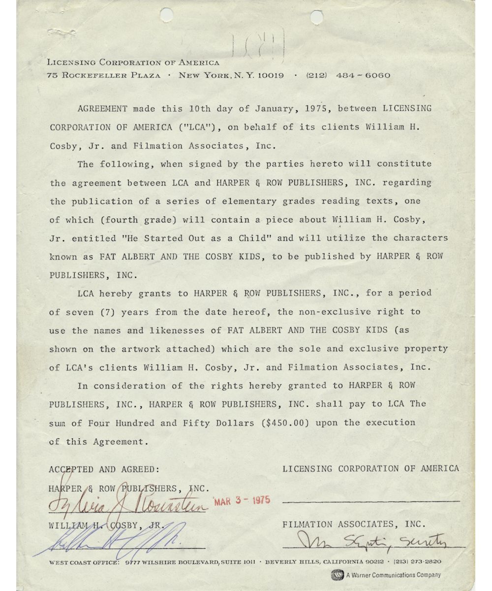 (b. 1937) is an American comedian, actor, author, television producer, educator, musician and activist. Typed D.S. "William H. Cosby", 1p. 4to., Beverly Hills, Jan. 10, 1975, an agreement between Cosby, publishers Harper & Row, (producers of the "Fat Albert" animated television show), and Licensing Corp. of America to permit a fourth grade reading text to include a piece about Cosby: "He Started Out as a Child" incorporating names and likenesses used in the television cartoon. The seven-year contract would net Cosby $450.00. File and staple holes at top, slight edge wear, else very good.