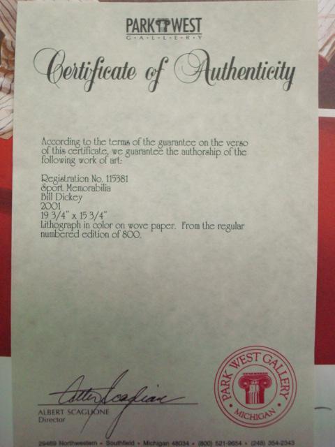 BILL DICKEY Signed & # Lithograph PALUSO with CA: From PARK WEST GALLERY 2001 Lithograph of Yankee Catcher #8 BILL DICKEY. 19 3/4" X 15 3/4" on Wove Paper Edition 80/800, Signed by Dickey and Paluso. Reg #115381 with Certificate of Authenticity. (200-400)