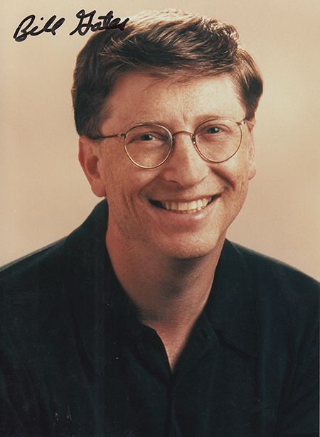 (b. 1955) American business magnate, computer programmer and philanthropist. Gates is the former chief executive and current chairman of Microsoft, the world’s largest personal-computer software company he co-founded with Paul Allen. S.P. 5" x 7" color, a casual chest, up pose, boldly signed. Fine.