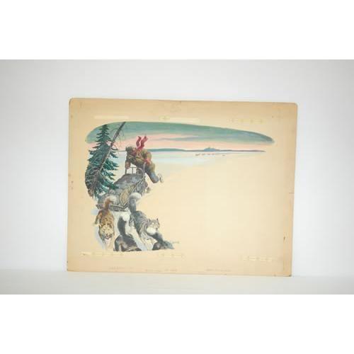 BILL GRIFFITH WATERCOLOR-GOUACHE FOR "SPORTS AFIELD" MAGAZINE-OCT. 1955 ISSUE DEPICTING A BOBSLED DRIVER BEING PERSUED BY A LARGE PACK OF WOLVES ON ANNOTATED ARTIST BOARD W/ TEXT CAPTION (17 1/4" X 23"-SIGHT SIZE) - WEAR, TONING, IMPERFECTIONS