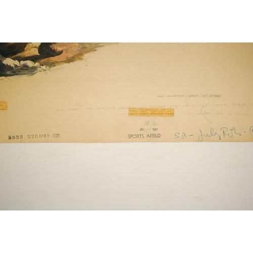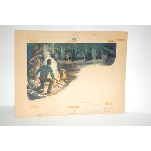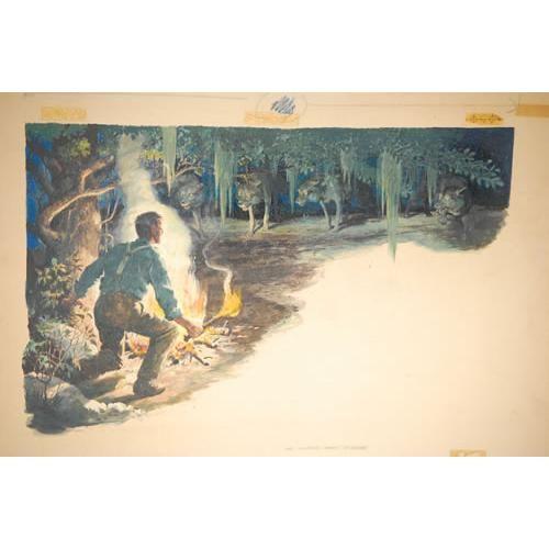 BILL GRIFFITH WATERCOLOR-GOUACHE FOR "SPORTS AFIELD" MAGAZINE-JUL. 1957 ISSUE DEPICTING A WOLF PACK ATTACK ON A MAN W/ CAMPFIRE ON ANNOTATED ARTIST BOARD W/ TEXT CAPTION (15" X 21 3/4"-SIGHT SIZE) - WEAR, TONING, IMPERFECTIONS