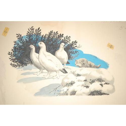BILL GRIFFITH WATERCOLOR-GOUACHE FOR "SPORTS AFIELD" MAGAINZE-APR. 1955 ISSUE DEPICTING SNOWY PTARMIGANS BEING STALKED BY A WOLF ON ANNOTATED ARTIST BOARD (APPROX. 12" X 15"-SIGHT SIZE) - WEAR, TONING & STAIN, IMPERFECTIONS