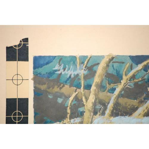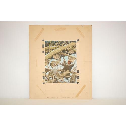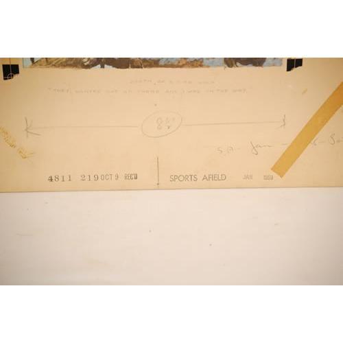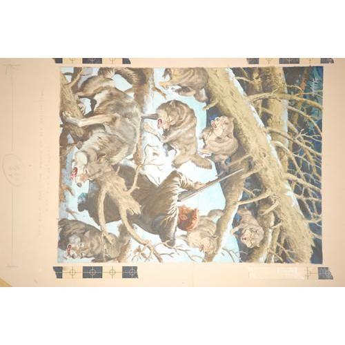 BILL GRIFFITH WATERCOLOR-GOUACHE FOR "SPORTS AFIELD" MAGAINZE-JAN. 1959 ISSUE DEPICTING A WOLF PACK ATTACK ON A HUNTER TRAPPED IN A WINTER THICKET ON ANNOTATED ARTIST BOARD W/ TEXT CAPTION (11 1/2" X 8 1/2"-SIGHT) WEAR, TONING, CREASE, IMPERFECTIONS