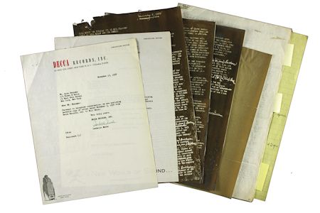 A document of historical importance in the annals of rock & roll is this contract between Bill Haley and Decca Records, dated March 29, 1954, signed by Haley and legendary producer, Milt Gabler, just two weeks before Bill Haley & The Comets recorded the epochal "(We're Gonna) Rock Around The Clock." Though Haley's music career began in 1943, his first recordings in the late 1940's were oriented towards country & western and western swing. Two years after forming the Saddlemen in 1949, Haley's style began to chance. In 1951, the Saddlemen recorded Jackie Brenston's "Rocket '88" (considered by many to be the first true "rock & roll' record), three years before the term came to describe the new genre. In 1952, Haley changed the group's name to Bill Haley with The Comets, and recorded "Rock The Joint." The melding of his style of country with rhythm & blues laid the framework for what was to come in 1954. Though "(We're Gonna) Rock Around The Clock," from that very first Decca Recording session in April 1954, only spent one week on the U.S. singles chart at #23, the second Decca single, a cover of Big Joe Turner's "Shake, Rattle & Roll," hit #7. After "(We're Gonna) Rock Around The Clock" was used as the theme song in the 1955 feature film, "The Blackboard Jungle", Bill Haley & The Comets became household names as the single was re-released, spending eight weeks at #1, and eventually becoming one of the biggest-selling singles of all-time. Although it was not the first rock & roll record, it was most certainly the most successful in the new genre, and is long regarded as a landmark recording in rock history. The four-page contract stipulates in part "...William J. Haley for himself and an organization known as Bill Haley and his Comets...Dear Mr. Haley: This contract for your personal services and the services of musicians is made between Decca Records, Inc. as the employer and you and the musicians who make up the orchestra represented by you as leader...will perform together for us under your leadership for the purpose of making phonograph records. Recordings will be made at recording sessions in our studios...A minimum of twelve record sides shall be recorded during the period of this contract, and additional recordings shall be made at our election. The musical compositions shall be mutually agreed upon between you and us, and each recording shall be subject to our approval as satisfactory, for manufacture and sale...We will pay you in respect of recordings made hereunder, a royalty of 5% of the retail list price in the country of manufacture...on 90% of all records sold...The period of this contract shall be one year commencing with the date hereof...you grant us the option to renew this contract for a period of one year...We agree that we will distribute for exploitation purposes at least 1,000 promotion records of each of the first three records released for sale hereunder". The contract continues to outline typical contractual obligations related to other issues, including union scale payments to participating musicians, royalty rates for recording with other artists, Decca's right to assign the contract to any of their subsidiary affiliates, respect for A F of M (American Federation of Musicians) rules, use of name and likeness for advertising and promotional purposes, and royalty rate stipulations for foreign sales. The contract is signed in blue ballpoint pen by Haley as "William J. Haley" and black fountain pen by Milt Gabler on behalf of Decca Records. Milt Gabler's signature on this contract further attests to his place in rock & roll history. Though he was more well-known in the jazz field as a producer for Billie Holiday, Ella Fitzgerald, Louis Armstrong, and Peggy Lee, among others, he also produced jump blues king Louis Jordan! Also included in this historic assemblage: 1) typed cover letter to Bill Haley related to the one-year extension of the contract from Decca Records to Bill Haley, dated December 3, 1954, 2) typed letter from Decca to Haley's attorneys advising them of contract extension, dated November 12, 1958, 3) three-page vintage photo copy of three-year contract renewal to commence on January 5, 1955, 4) vintage photocopy of royalty accounting figures between 1954 and 1958. The 11" x 14" contract and attachments are twice stapled. The pages exhibit mailing folds and a few scattered wrinkles and stains.