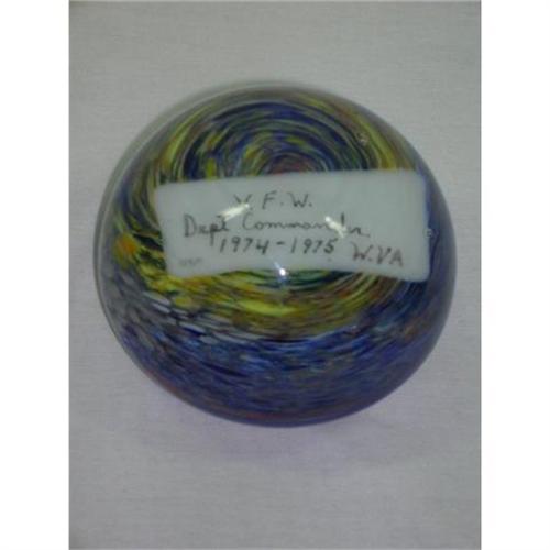 This is a great hand made piece of glass. The paperweight was made and signed by Bill Heinle for the West Virginai V. F. W. Dept. Commander of 1974-75, which is spelled out in the milkglass placard on the inside. The pattern behind this is a swirl of green, orange, blue, yellow and white. The paper weight is 2-1/4" tall and 3-1/2" in diameter. The bottom is impressed with "Bill Heinle". I have not been able to find out anything about this Glass Craftsman but I am assuming that it was made in West Virginia. This is a beautiful and heavy glass paperweight. There are no chips, flakes or cracks.