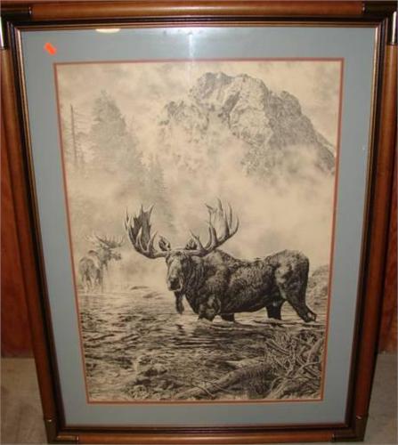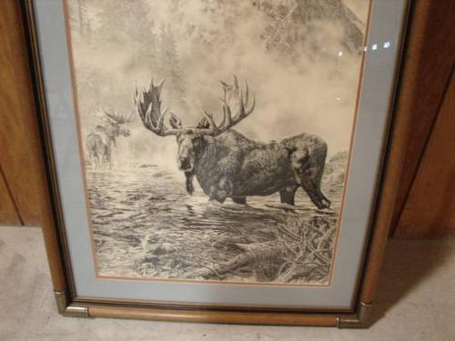 BILL O'NIELL WILDLIFE PRINT. Depicts a moose standing in water. Signed in lower right. 28.5" x 37.5" framed