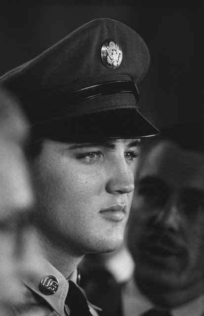 Elvis Presley served in the United States Army between March 1958 and March 1960. At the time of his draft he was one of the most well-known names in the world of entertainment. Bill Ray signed silver gelatin: Elvis Presley up close. Later print.