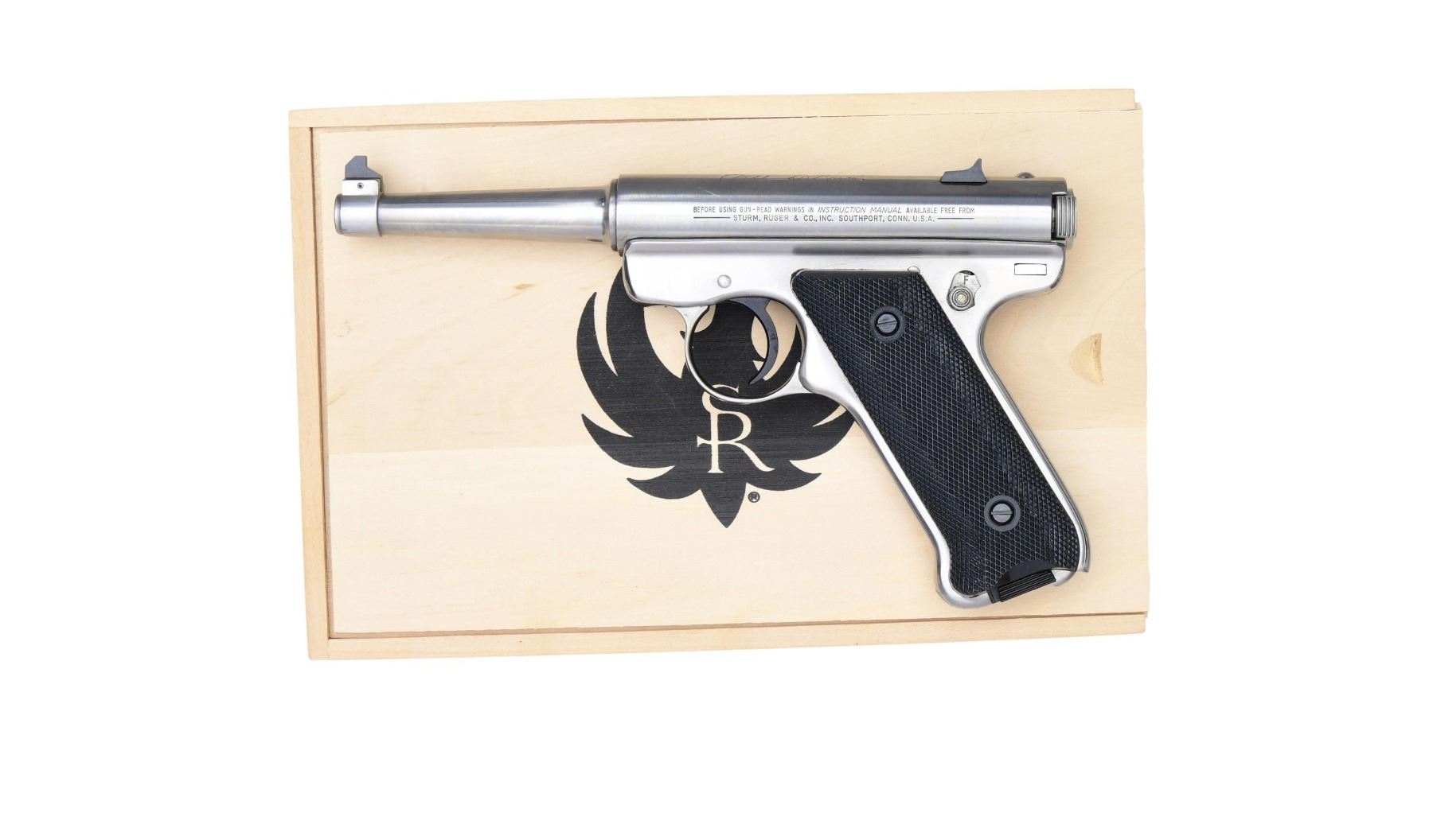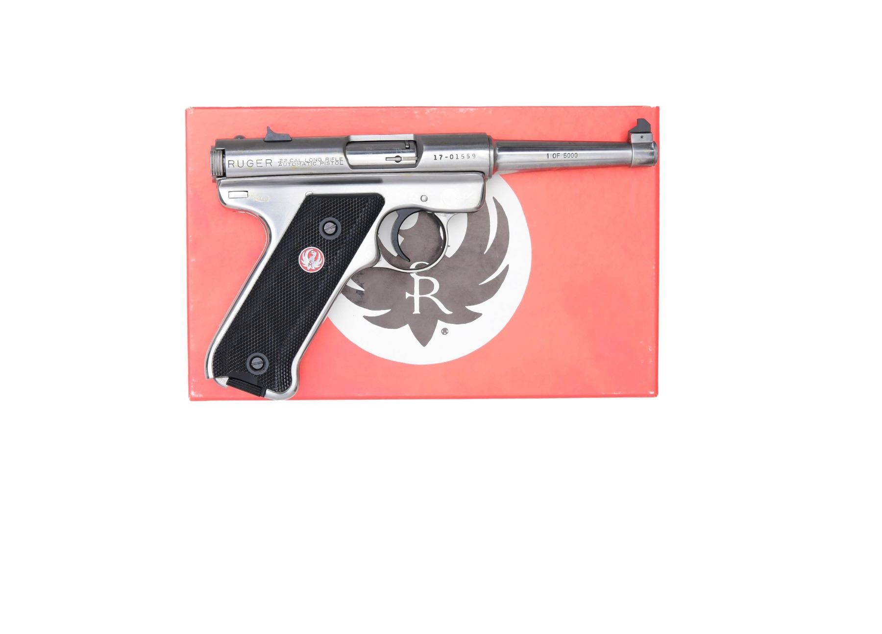 STANDARD MODEL SEMI AUTO PISTOL Cal. 22 LR. S# 17-01559 (1981). Bbl. 6" with fixed front & rear sights and a standard frame configuration. This Ruger Standard Model features a stainless finish. Top of pistol has Bill Ruger signature engraved. The grips are checkered black polymer. MAGS: one 10rnd. UNATTACHED ACCESSORIES: factory red box, factory wood box, and paperwork. CONDITION: overall, near excellent condition, with approximately 95% of the original stainless finish remaining on the slide; the frame retains about 95% of the finish. Bore is bright with strong rifling. (24-2903/MD). MODERN. $300-$500.