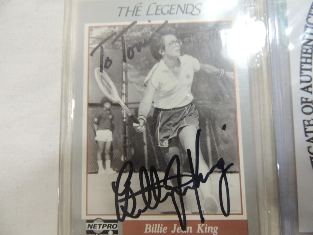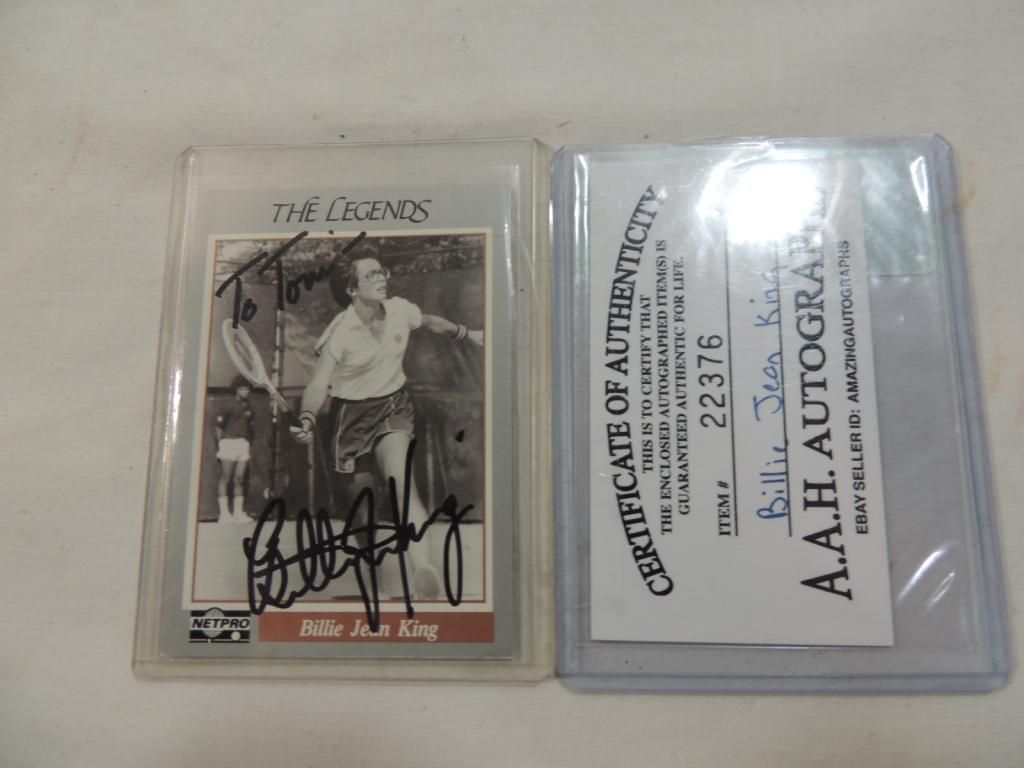 BILLIE JEAN KING AUTOGRAPHED TENNIS PLAYER CARD. TENNIS LEGEND COA INCLUDED AS SHOWN SEE PHOTO FOR MORE DETAILS.