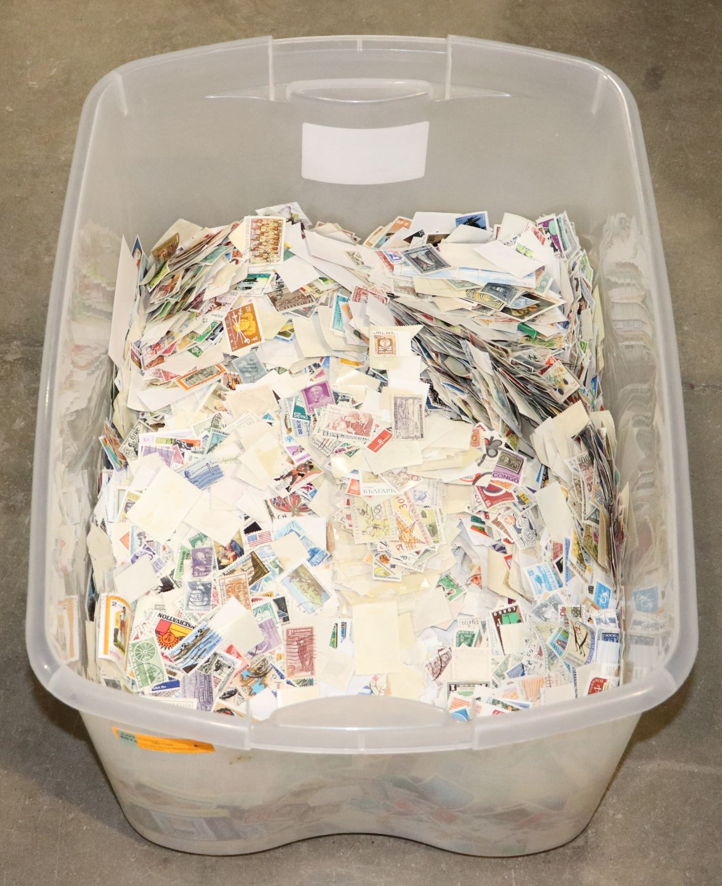 BIN OF 100,000 PLUS MINT AND USED WORLD STAMPS