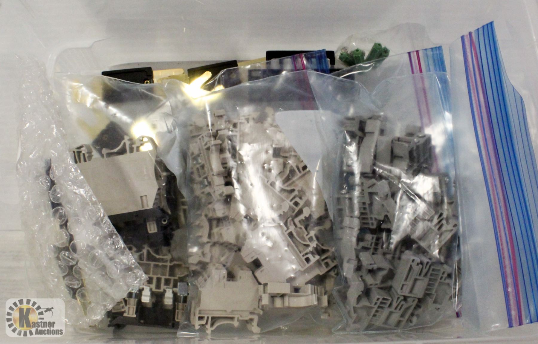 BIN OF 120 VOLT ELECTRIC DIN RAIL PARTS