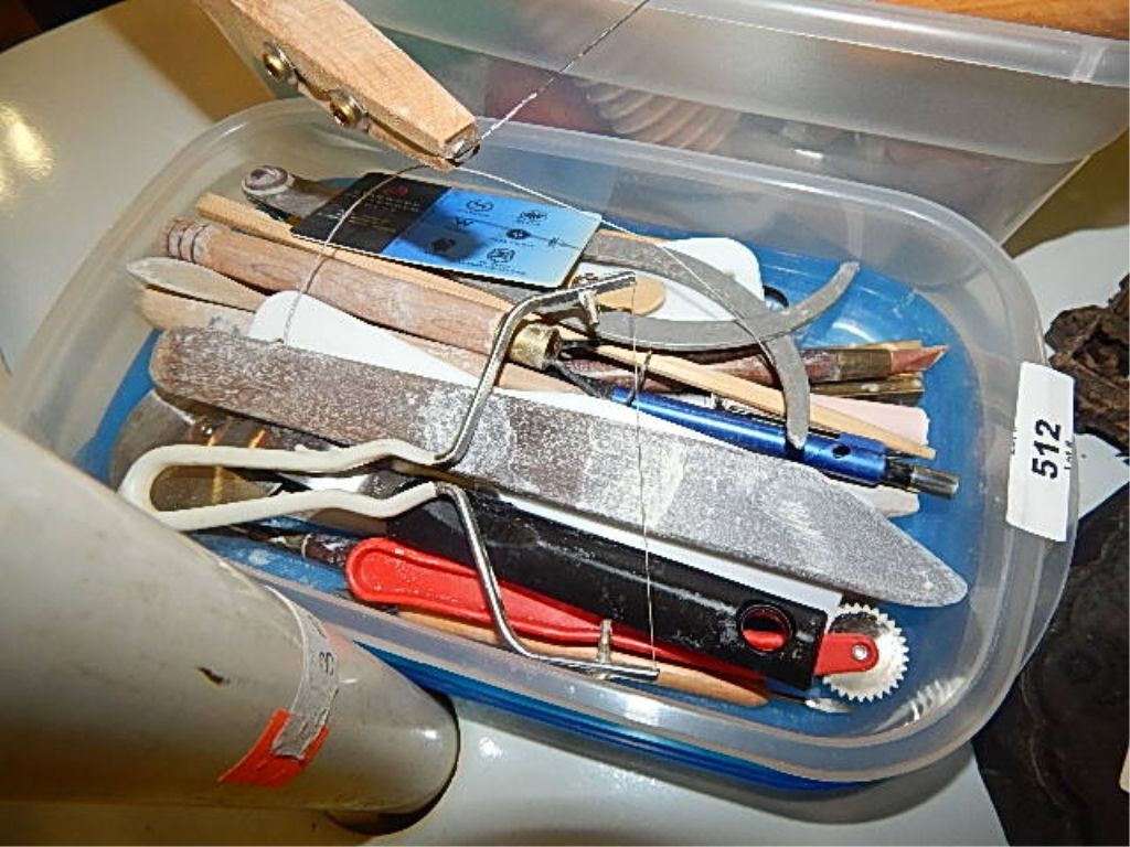 BIN OF ASSORTED CERAMIC TOOLS ETC